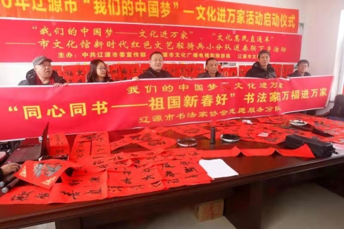 为贯彻落实中宣部及省委宣传部、省文旅厅关于深入开展新时代“红色文艺轻骑兵”小分队送文化下基层、“我的中国梦文化进万家”、“文化惠农直通车”、“健康生活 悦动吉林”等活动通知精神,2020年1月6日上午8时,由中共辽源市宣传部、辽源市文化广播电视和旅游局,辽源市文学艺术界联合会主办,辽源市文化馆承办,东丰县文旅局、东辽县文旅局、西安区文旅局协办的《我们的中国梦文化进万家》“送春联下乡”、“辽源市新时代“红色文艺轻骑兵”市文化馆小分队文化惠农直通车走进东丰县永和村,从这里展开了春节前夕为期5天的下乡送春联活动。从元月6日-元月10日,“红色文艺轻骑兵”市文化馆小分队文化惠农直通车安排: